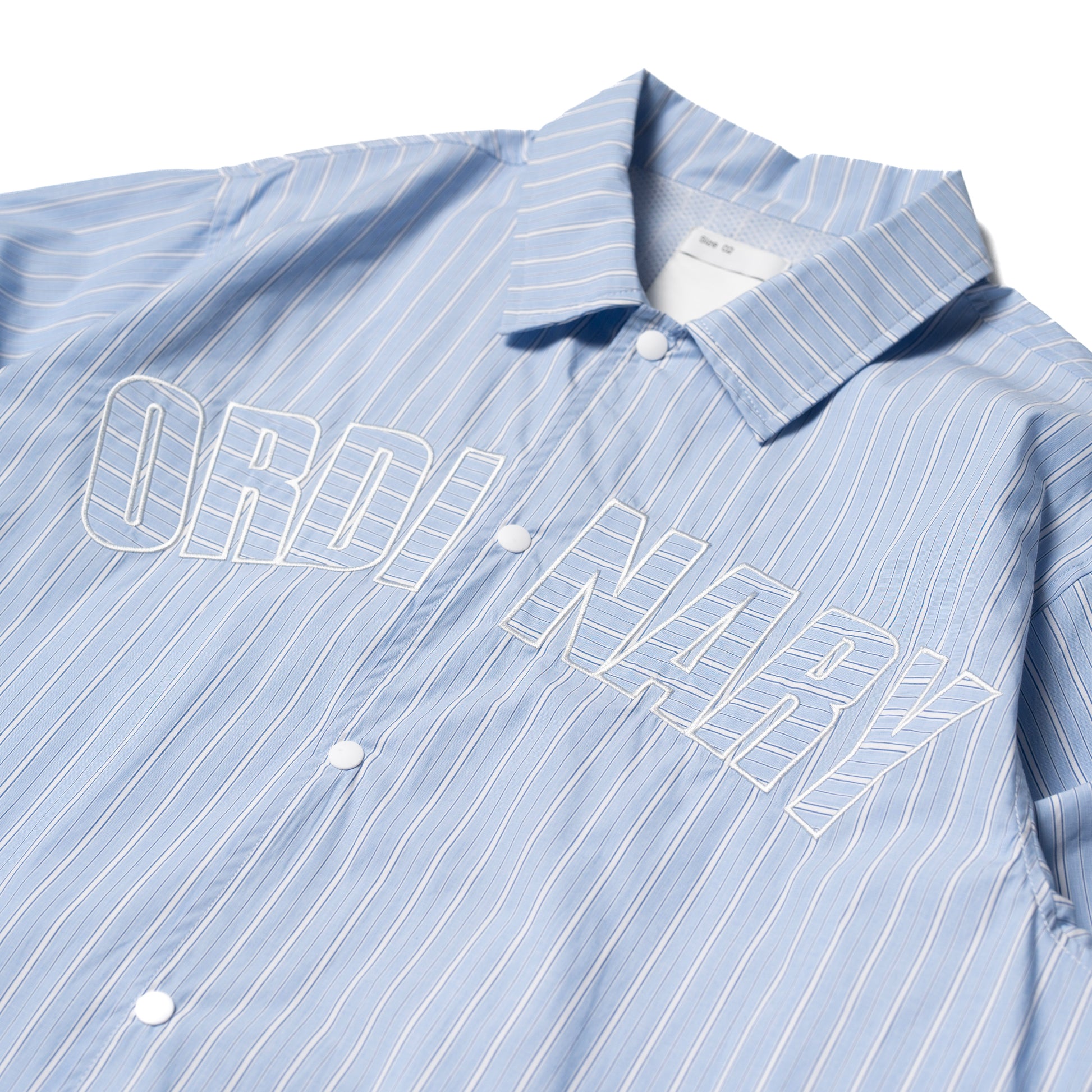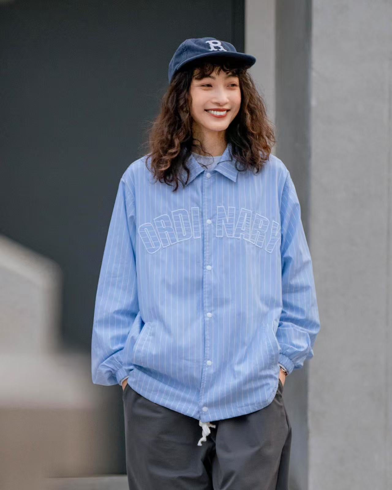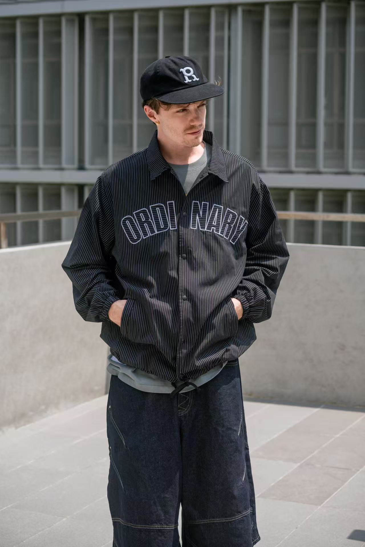 🔹 正面以拱形「ORDINARY 字樣刺繡作為主視覺,線條與條紋布料交錯呼應,簡潔而鮮明地凸顯品牌語言。