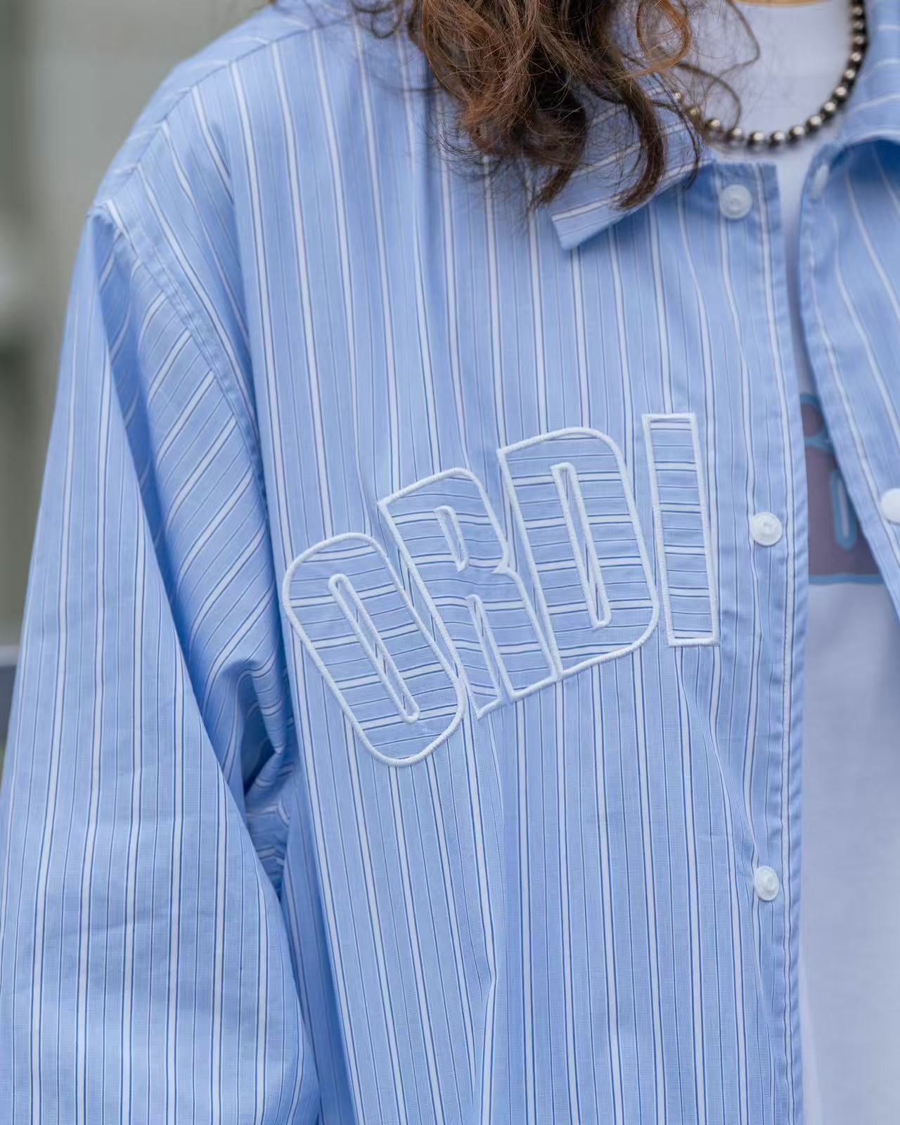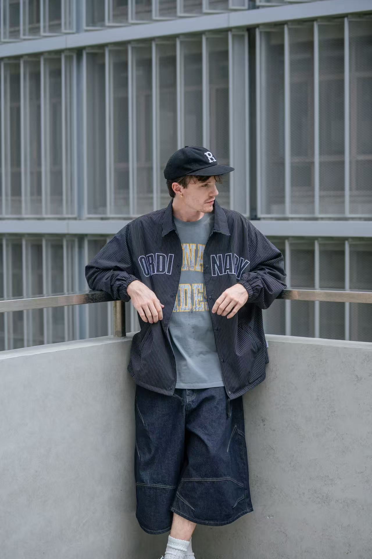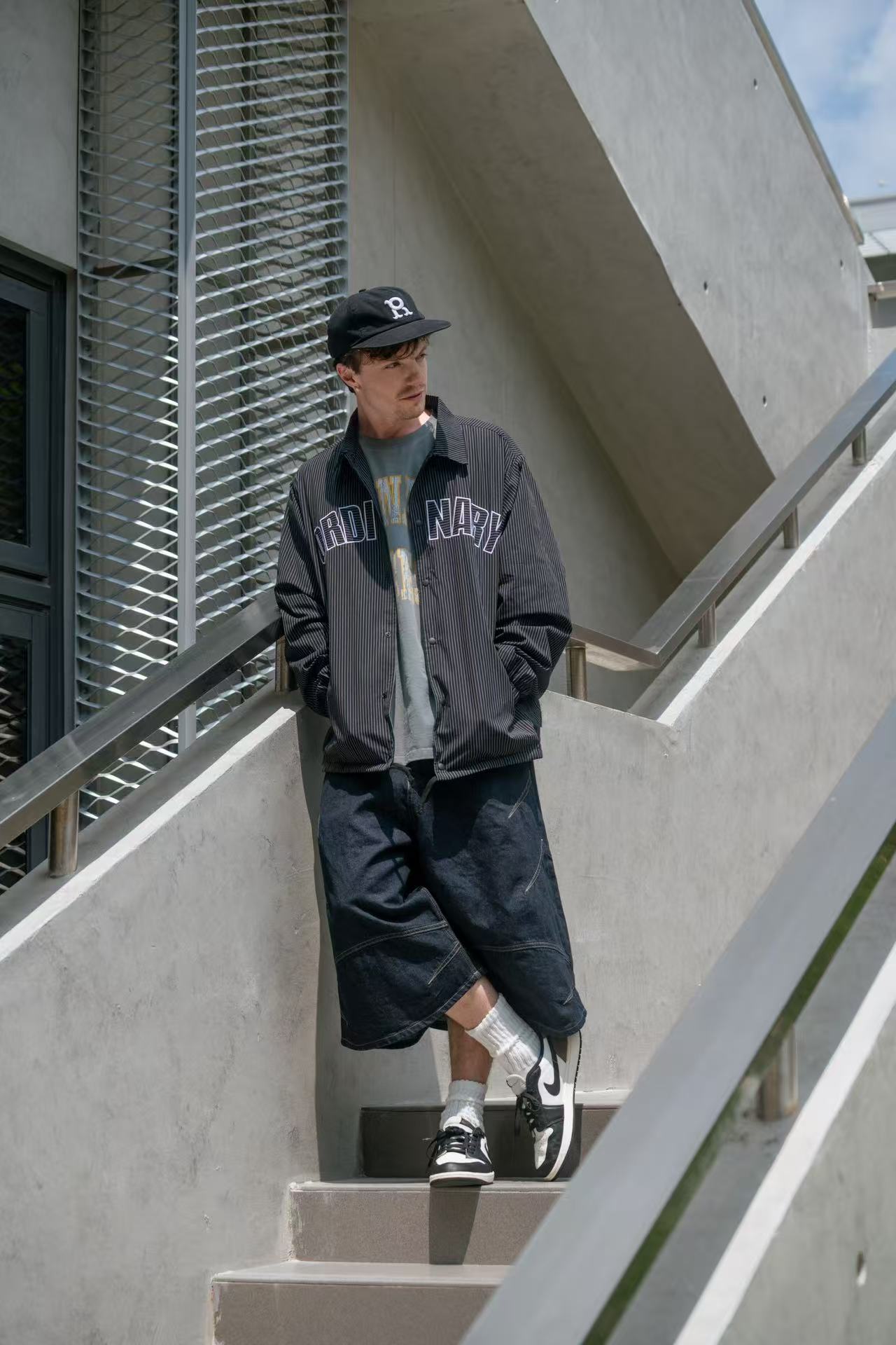 🔹 正面以拱形「ORDINARY 字樣刺繡作為主視覺,線條與條紋布料交錯呼應,簡潔而鮮明地凸顯品牌語言。